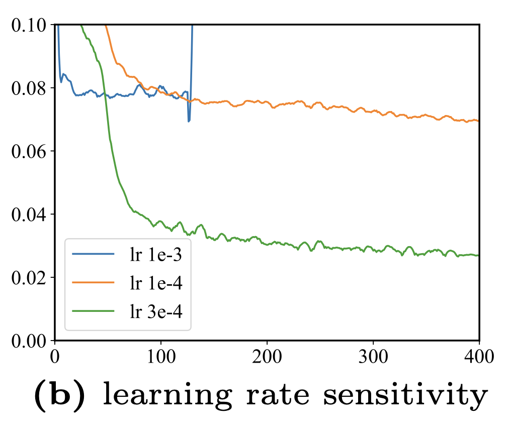 학습률이 1e-3일 때, 모델은 붕괴하는 것을 볼 수 있다. 논문에서도 향후 과제로 robust하게 만들어야 함을 강조한다.