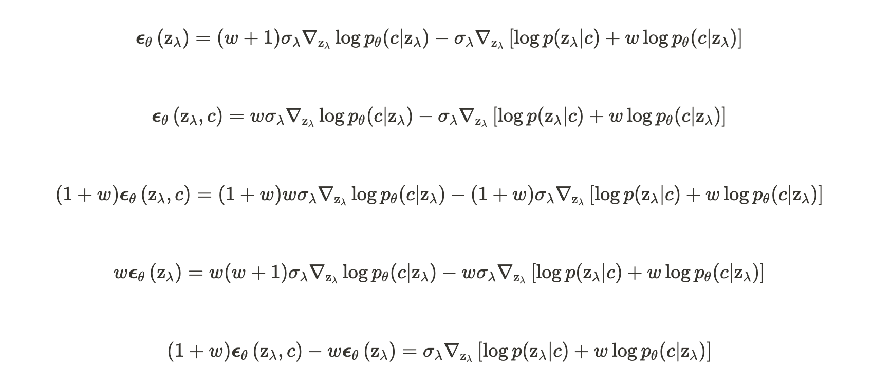 그냥 직관적으로만 보아도, 기존 Diffusion 모델의 목표 분포인 log p(z_λ|c) 에다가, 분류기에 관한 식 log p(c|z_λ) 를 넣어놓은 것을 볼 수 있다.
