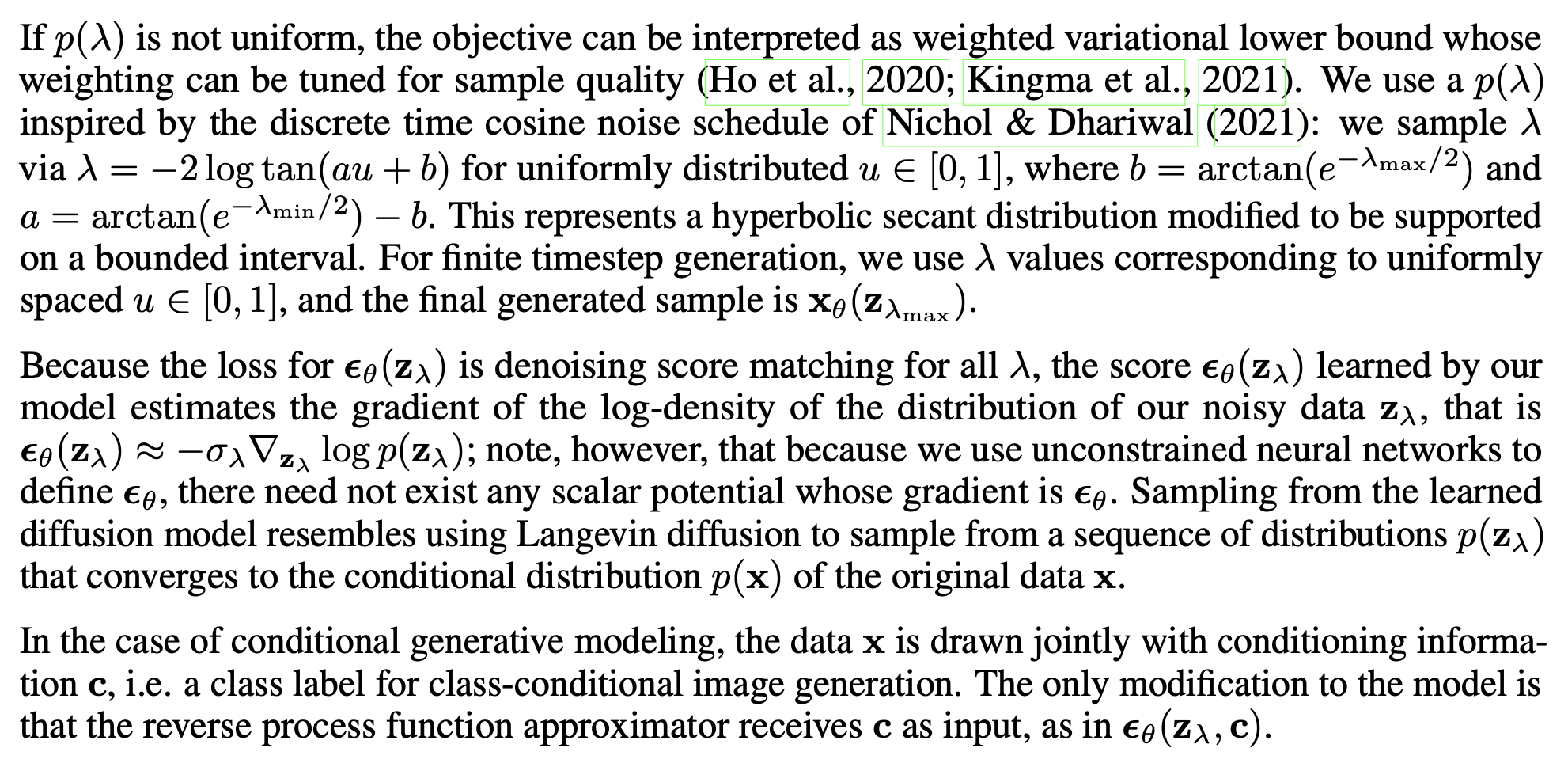- p(λ)는 cosine noise schedule에 기반하여 hyperbolic secant 분포로 설정된다.