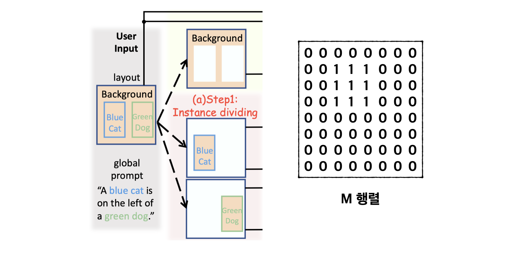 이 논문은, input으로 텍스트 프롬프트와 함께, 생성을 원하는 특정 물체의 bounding box를 함께 입력으로 넣어 생성하는 task를 연구한다. 그러므로 각 bounding box 내에 물체가 생성되고, 또 bounding box에만 생성되도록, 그에 맞는 M 행렬을 준비해야 한다.