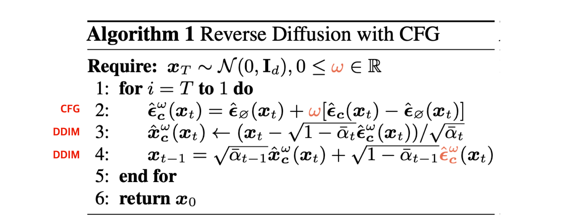위의 수식으로 유도된 CFG++의 알고리즘이다. 보면 사실 달라진 것이라고는, w가 λ로 바뀐 것과, 저 파란색 입실론(제거 노이즈를 의미)이 조건부에서 무조건부로 바뀌었다는 것 말고는 없다. 편의를 위해 알고리즘 1을 밑에 다시 첨부한다.